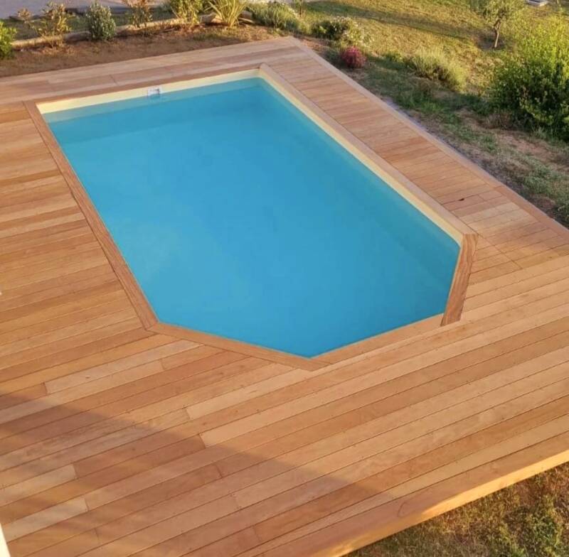 Habillage d'une piscine hors sol avec une terrasse sur pilotis en itauba